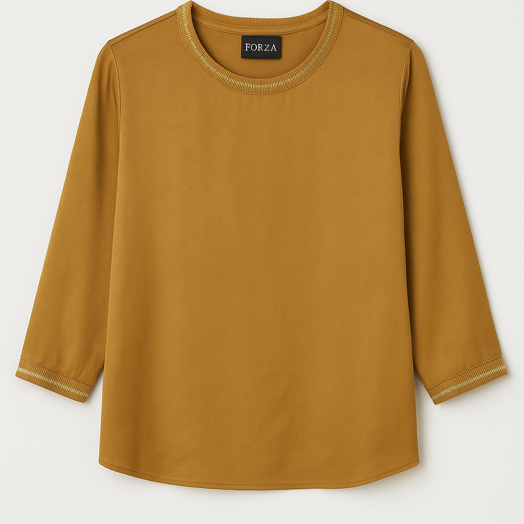 Top in 100% viscose met een 7/8 mouw. Langs de hals en mouw een bies met goud lurex . Verkrijgbaar in 5 kleuren .