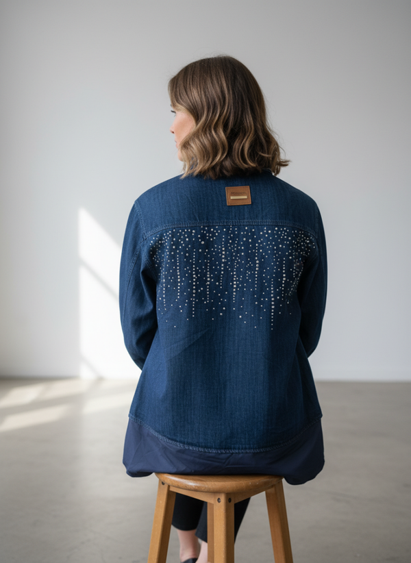 Denim blouse met strass details op de voor en achterkant , de kraag is dubbel met uni donkerblauw. De blouse is 1 maat en te dragen t/m 42